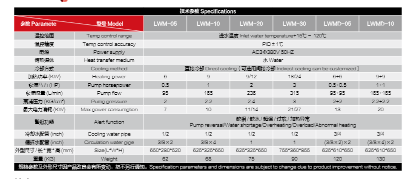 LWM系列水溫機是以水為循環(huán)介質的模溫機,也常被稱為水溫機/水加熱器/水循環(huán)模溫機/水溫度控制機/水加熱機/水模溫機,其控制溫度可分為98℃/120℃/150℃/180℃水溫機。加熱功率3KW-1200KW可選。擇在各行業(yè)的使用非常普遍,在選擇時主要依據(jù)加熱功率,泵浦性能,冷卻能力這幾方面來進行考慮。相對采用導熱油為循環(huán)介質的油溫機來說,其換熱效率更高,使用和保養(yǎng)也更簡單和清潔,只需要連接自來水就可以使用。尤其在一些對運行環(huán)境要求較高的行業(yè),具有非常大的優(yōu)勢。
