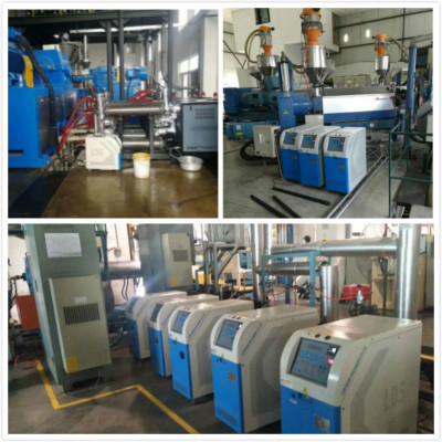 擠出模溫機用于控制擠出機料筒和機頭的溫度,在擠出和擠塑生產(chǎn)過程中,預(yù)熱對于塑料盒橡膠制品都是不可缺少的。在擠出產(chǎn)品成型時不允許氣孔的存在,產(chǎn)品在擠包前通過高溫預(yù)熱可以清除表面的水分、油污。防止由于潮氣的作用而產(chǎn)生氣孔的可能。模溫機預(yù)熱還可防止擠出中塑料因驟冷而殘留內(nèi)壓力的作用。在擠塑料過程中,預(yù)熱可消除冷線進入高溫機頭,在??谔幣c塑膠接觸時形成的懸殊溫差,避免塑膠溫度的波動而導(dǎo)致擠出壓力的波動,從而穩(wěn)定擠出量,保證擠出質(zhì)量。擠塑機組中在料筒階段均加裝預(yù)熱裝置,要求有足夠的容量并保證升溫迅速,提高生產(chǎn)效率。預(yù)熱溫度受放線速度的制約,一般與機頭溫度相仿即可。