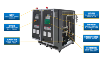 其工作原理是:高溫循環(huán)水從應(yīng)用設(shè)備(模具)出來后進(jìn)入水循環(huán)溫度控制機(jī),設(shè)備根據(jù)設(shè)定的溫度對循環(huán)水進(jìn)行加熱或冷卻,并由循環(huán)泵浦輸送到應(yīng)用設(shè)備(模具)的管道入口,由此達(dá)到恒溫控制。管路防爆裝置/回水溫度顯示/開機(jī)自動(dòng)排氣功能/加熱功率切換功能/隔離式電器控制箱,延長電器使用年限/熱水BY-PASS 卸壓回路/水泵馬力和加熱功率可以定做/不銹鋼一體管路,減少管阻及銹垢/溫度精確的控制在±1°C以內(nèi)/控制方式:采用進(jìn)口為電腦或PLC/安全保護(hù)完善,故障顯示,維修,保養(yǎng)無需專業(yè)人員即時(shí)冷卻關(guān)機(jī)功能/多點(diǎn)溫度控制機(jī)組功能